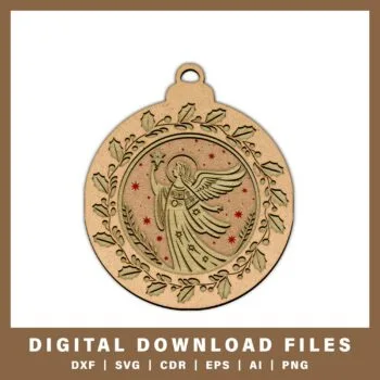 $5.00Original price was: $5.00.$0.99Current price is: $0.99.Download this Angel Silhouette with Holly Wreath Laser Cut Christmas Ornament File for elegant holiday decor. Perfect for laser cutting on 1mm or 2mm MDF sheets. Available in multiple formats.